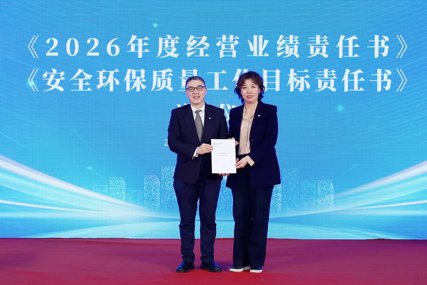 公司各单位、各部门主要负责人现场递交《2026年度经营业绩责任书》《安全环保质量工作目标责任书》。